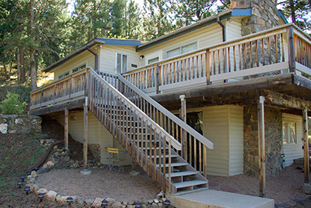 north of historical downtown Evergreen. The house is nestled on .3 acres on a mountainside at approximately 7400 feet in elevation, and offers a perfect blend of mountain living with the convenience of city amenities nearby. The Fir House is available for family, vacation, holiday, honeymoon, and corporate rental.